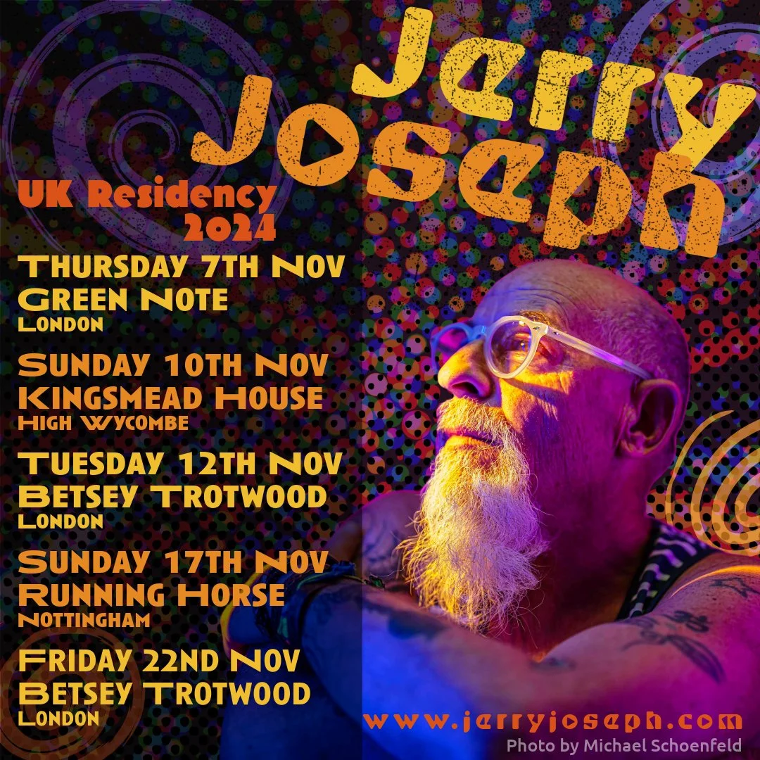 Jerry Joseph is bringing his captivating live performances to the UK for a special residency this November! These intimate shows offer a rare chance to experience Jerry's raw energy and storytelling up close at some of the UK’s most iconic venues. Don’t miss your chance to see him live in London, High Wycombe, and Nottingham. Grab your tickets now!